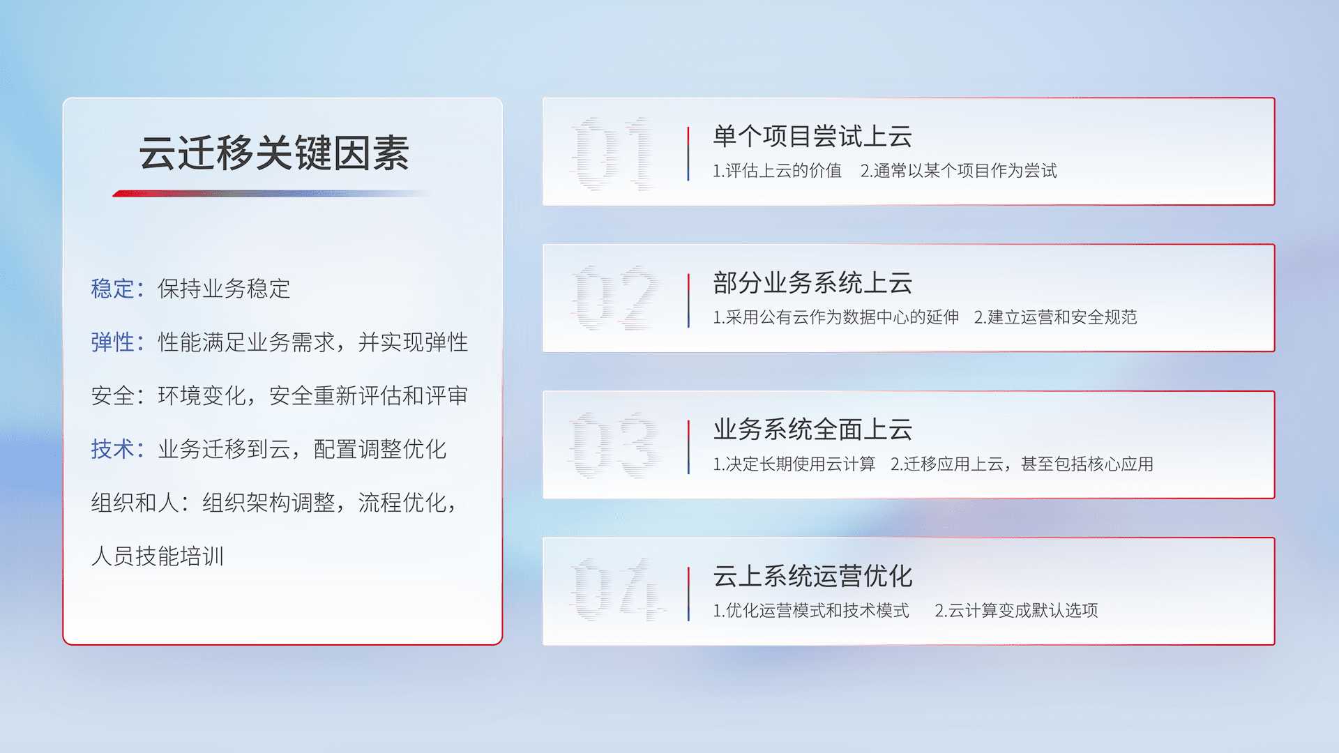 结合实际业务,,从规划设计、、云平台选型、、、、云原生改造、、、数据迁移、、集成交付,,,,迁移全过程为客户识别最佳上云路径,,,做好风险识别管理,,,设计网络架构、、身份权限、、安全审计合规、、操作审计、、日志审计、、监控告警策略、、多站点容灾设计等,,,对云上基础设施进行整体规划,,,提升IT治理水平,,,以满足弹性、、高可用、、、、高性能的需求。。