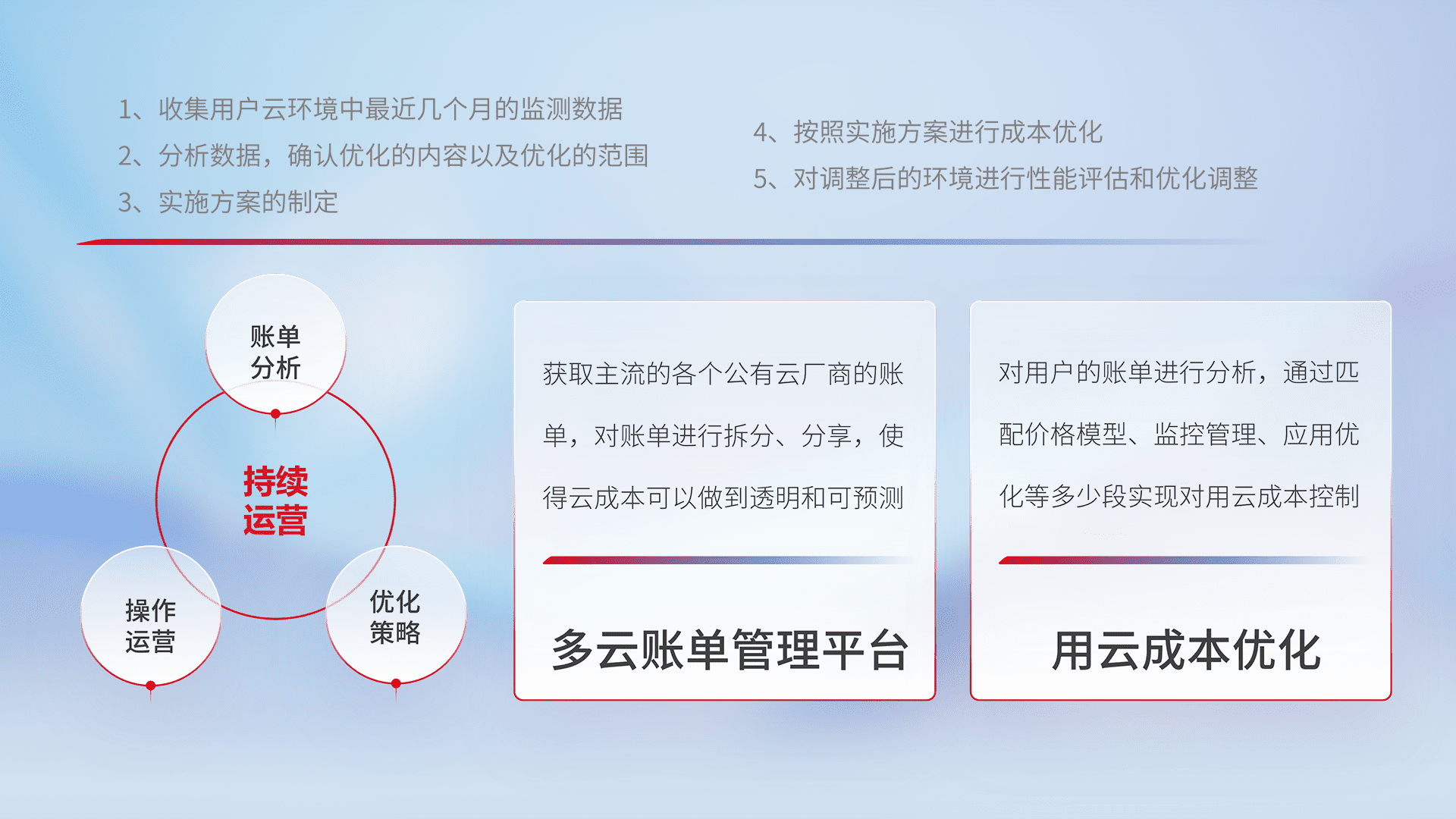 通过多云纳管,,,,以统一的资源数据模型把客户的云资源进行抽象和封装,,,,进而实现对多云资源的统一操作,,保障云资源管理的可靠性、、稳定性与可用性。。量身定制化运维内容,,,,配置、、、、开发运维、、补丁管理、、备份、、、、监控、、、、认证和访问管理、、、、审计和日常巡检等,,,,保障在用云过程中的可靠度,,稳定度以及高可用率。。